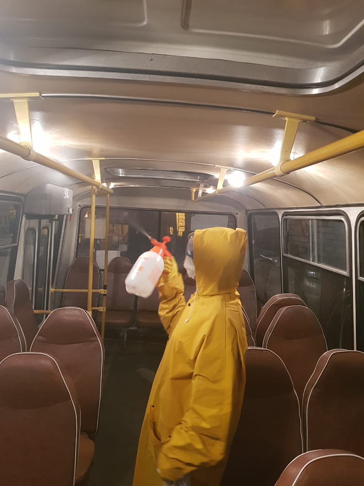 Кроме предрейсовой обработки меры по профилактике вирусной инфекции применяются в течение дня – на конечных остановочных пунктах салон протирается дезинфицирующими салфетками или обрабатывается растворами.