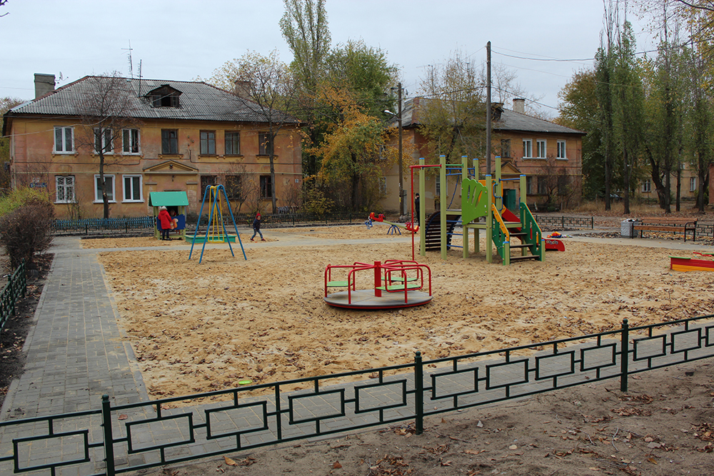 На территории были проведены работы по организации тротуарных дорожек, детской площадки, установлены спортивно-игровое оборудование и малые архитектурные формы, скамейки, урны.