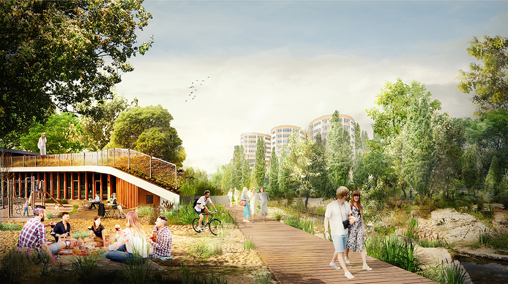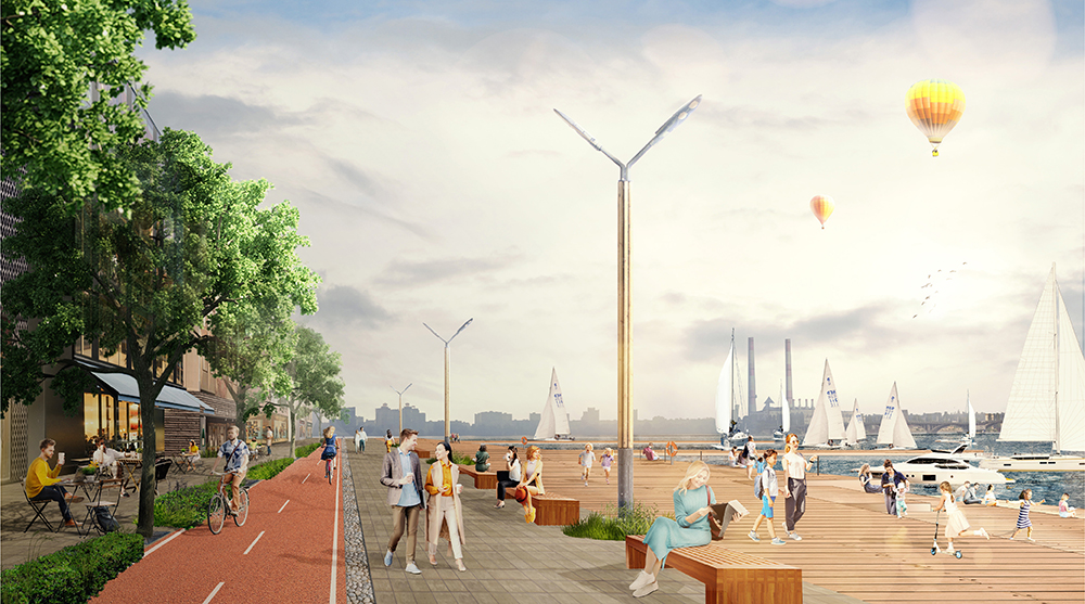 Озеленению требуется уделить особое внимание: в спортивной зоне в дополнение к существующим насаждениям необходимо предусмотреть высадку разногабаритных деревьев с раскидистой листвой для создания шумопоглощающего барьера, в буферной зоне также должна быть высадка крупномерных деревьев, а еще – плодовых деревьев, кустарников, газонов-миксбордеров в свободных от деревьев зонах. Все озеленённые территории будут оборудованы автополивом.Планируется также восстановление ограждения набережной, облицовка подпорной стенки на Адмиралтейской площади, создание радиальной перголы. Вся территория должна получить новые малые архитектурные формы (урны, лавочки и т.д.), сети наружного освещения и др.