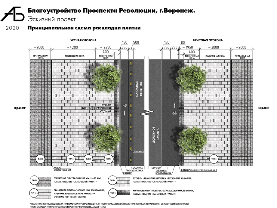 – В качестве материала мощения выбран гранит двух видов. Его внешний вид обеспечивает акцент на фасады здания и элементы благоустройства, визуально расширяет пространство. Многие здания по проспекту имеют серый цоколь и будут сочетаться с мощением прифасадой зоны. Форматы мощения также подобраны исходя из функциональных зон тротуара, предусмотрено предупреждающее мощение из колотого гранита вместо тактильной плитки. На стыке транзитной и прифасадной зоны будут установлены водоотводные лотки из полимербетона, которые окрасят в цвет прифасадной зоны. Подобранные варианты учитывают требования по прочности гранита, - рассказала Екатерина Белоус.