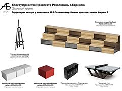 Приствольные решетки предложено выполнить с мелкой ячейкой без перепада высот, в одном уровне с мощением. Для защиты стволов деревьев было принято решение использовать бамбуковые маты, которые выглядят визуально легче и не занимают дополнительное пространство. Урны выбраны простой формы, контрастные по цвету к мощению – это рекомендация РУРЦ «Доступная среда»: для того, чтобы урны были заметны слабовидящим людям.