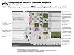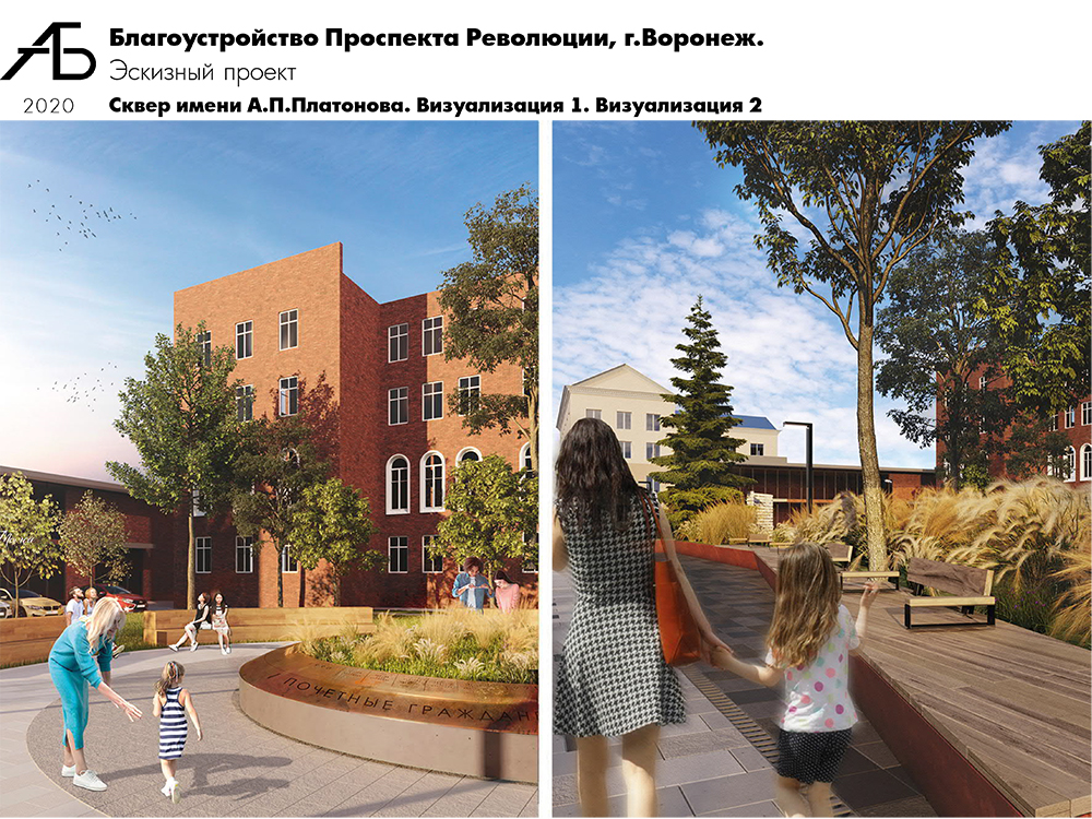 Сквер имени А.П. Платонова – литературная площадка. Здесь по транзитной зоне тротуара предусмотрены места отдыха в виде парапета с деревянными сидениями. На территории сквера будет установлена уличная библиотека с защитой от атмосферных воздействий. Благоустройство дополнено скамейками-трибунами для отдыха, площадкой для выступлений с точкой подключения оборудования. Озеленение сквера предлагается дополнить высадкой деревьев, в том числе вечнозеленых, и посадкой многолетников. Рассматривается возможность размещения в сквере знака «Почетный гражданин города Воронеж». В связи с изменением границ проектирования на территории арок здания Управления ЮВЖД будут установлены стенды для постоянных и временных экспозиций художников, оснащенные подсветкой и защитой от атмосферных воздействий, что позволит привлечь жителей и гостей города в музей имени Крамского.