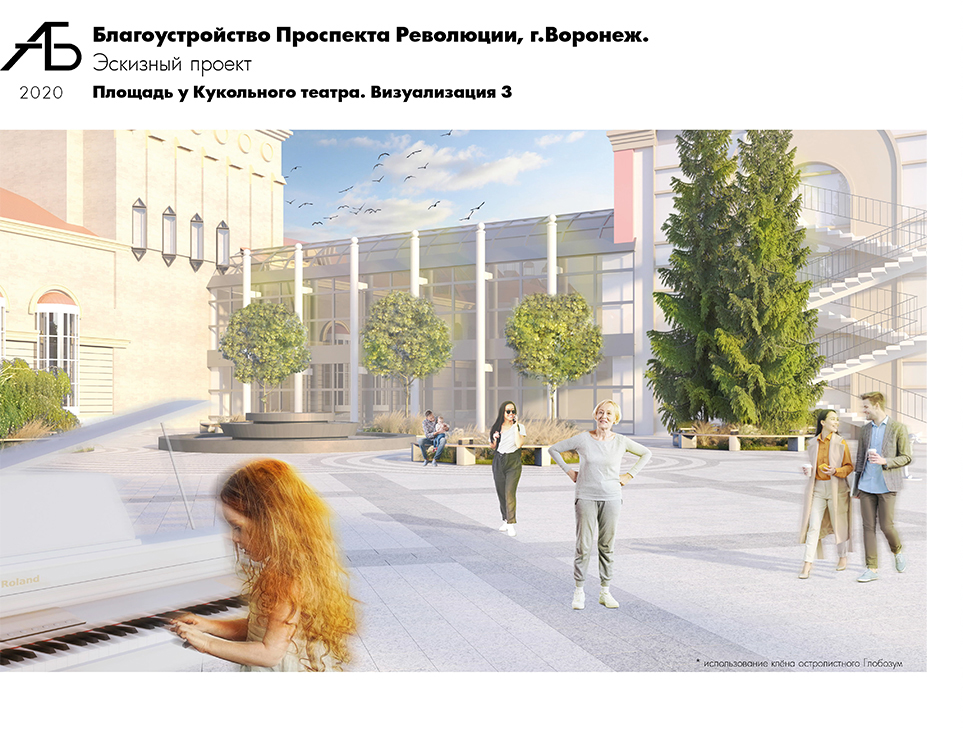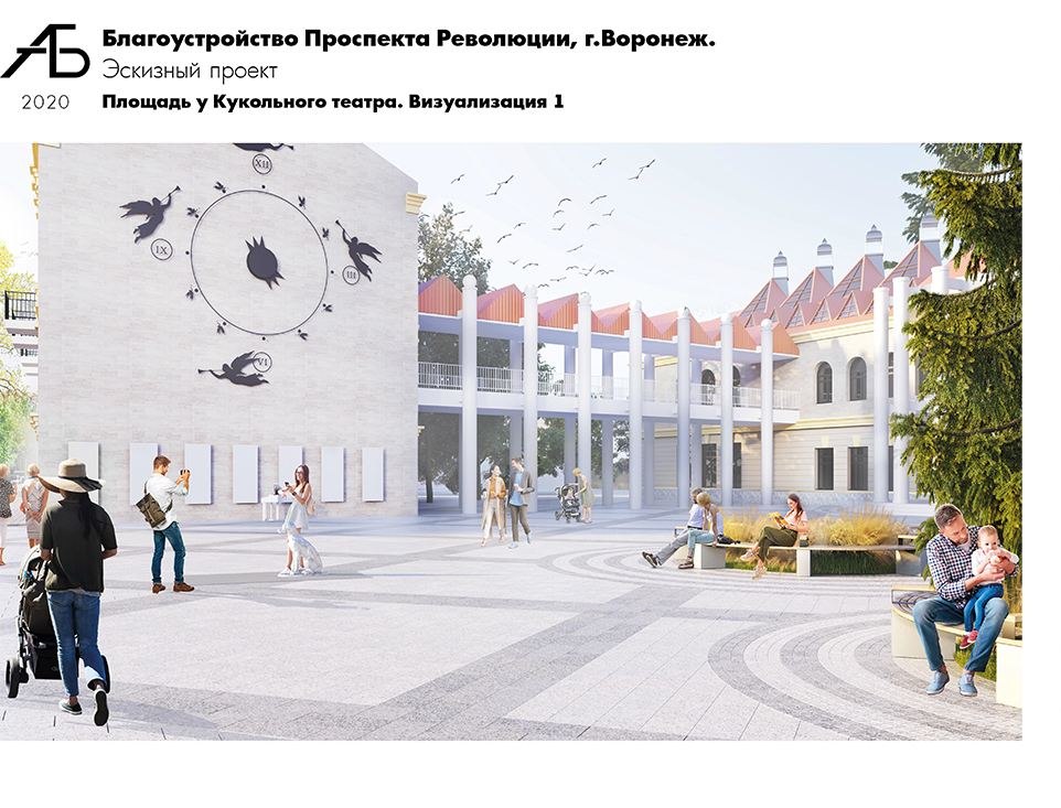 Следующая площадка, расположенная у дома 47, по концепции «Время романтики», предложенной представителями общественности, предусматривает размещение беседки «Михайловский часы».– Мы представили внешний вид беседки на основании фото прошлых лет. Полная проработка этого объекта не входит в объемы работ на данный момент и требует отдельного рассмотрения с привлечением краеведов и других специалистов, – отметили проектировщики.Территория у театра кукол «Шут» будет соответствовать концепции «Музыка мира»: на этой площадке старались учесть пожелания дирекции театра, соавторов самого архитектурного облика его здания и площади, а также потребность горожан в площадке для проведения танцевальных мероприятий. Функционально площадку для этих целей разместили на территории за театром. Там уже есть территория, где возможна замена мощения. Иных сооружений на этом участке проектом не предусмотрено. У входа в театр предложено проведение мощения с сохранением фонтана, уже существующей клумбы с ивой и елями, которые предусмотрено дополнить озеленением с устройством скамеек, а для создания визуального акцента на фасад театра предлагается высадка деревьев с правой стороны здания.
