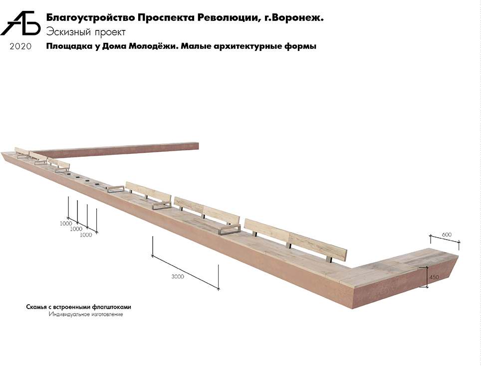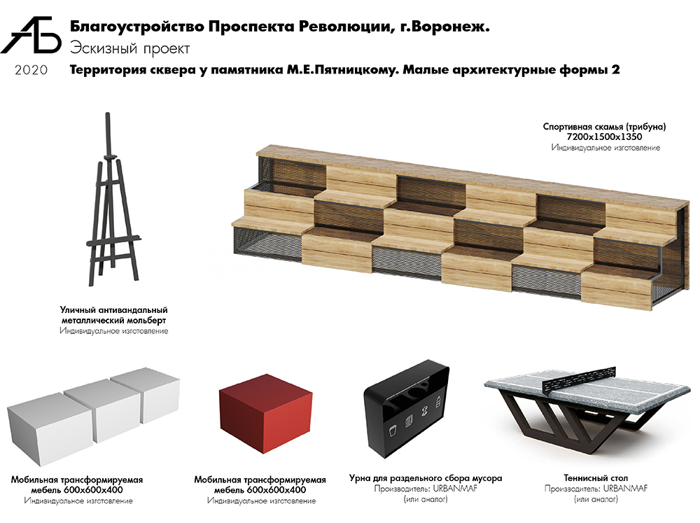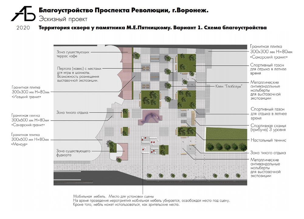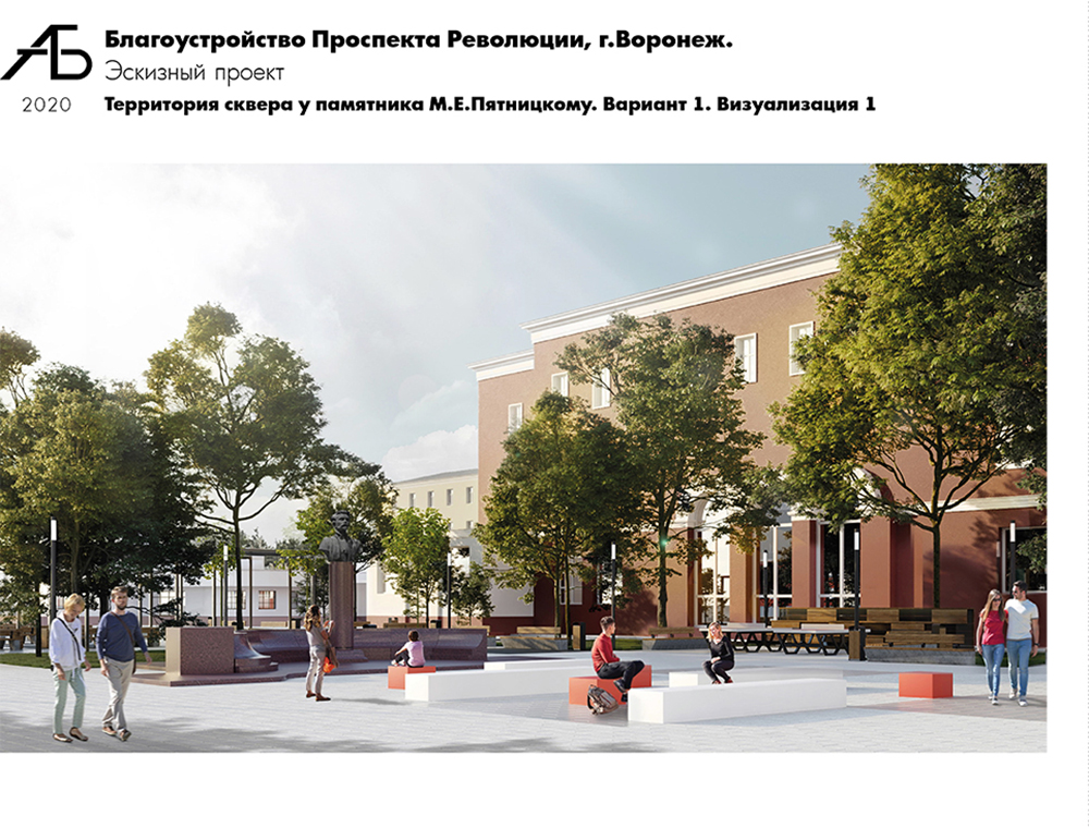 Следующая территория – сквер у памятника Пятницкому – рассматривается как площадка для тематических мероприятий и встреч по интересам. Проектом предложены навесы (перголы), под которыми разместятся столы для игры в шашки/шахматы, столы-стойки для организации выставок, теннисные столы и места для отдыха. Кроме того, на площадке возможна установка мобильной трансформируемой мебели, уличных металлических мольбертов, подключения аппаратуры. Сохранится и сложившаяся структура озеленения.Еще один объект благоустройства – площадка у Дома молодежи. Здесь планируется размещение флагштоков, организация мест отдыха и встреч.