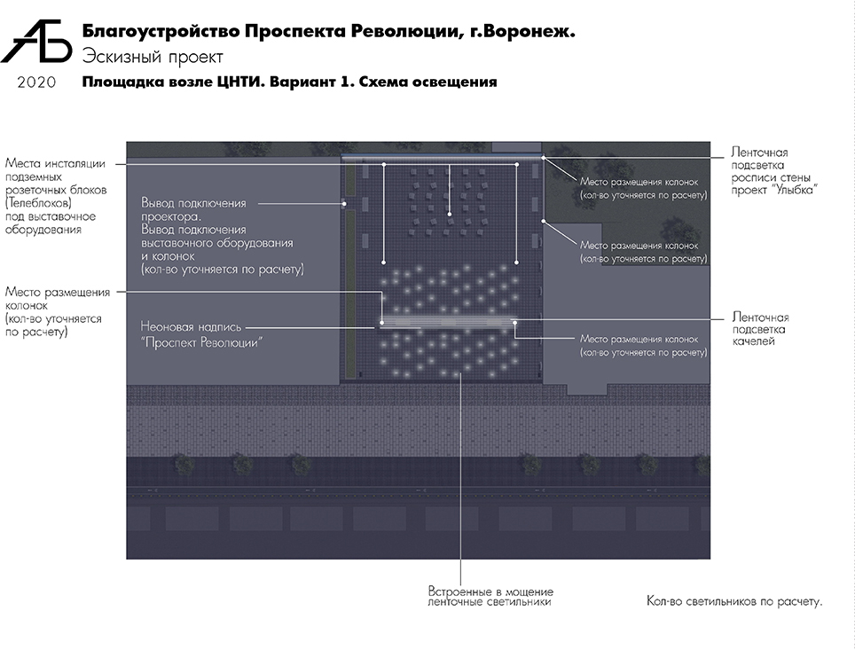 Организация площадки у ЦНТИ предусматривает благоустройство с установкой качелей с навесами, мобильной уличной мебелью. Тыльная стена предполагает размещение объекта стрит-арта – росписи «Улыбка». Этот вопрос обсуждался ранее в ходе встречи главы города с художником Яном Посадским. В мощении предусмотрены подъемные (выдвижные) телеблоки для подключения оборудования, выставочных экспонатов, дополнительного освещения и пр.