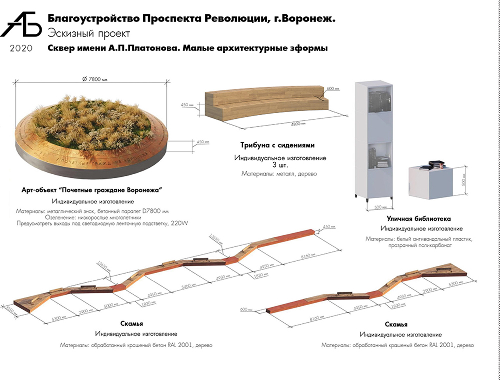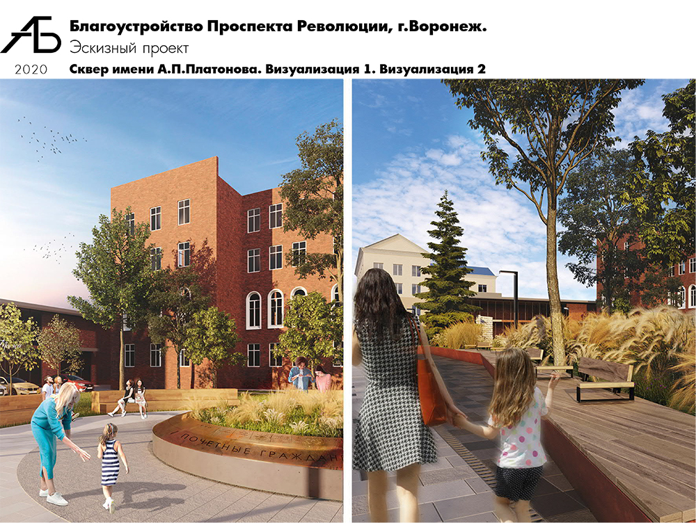 Сквер имени А.П. Платонова – литературная площадка. Здесь по транзитной зоне тротуара предусмотрены места отдыха в виде парапета с деревянными сидениями. На территории сквера будет установлена уличная библиотека с защитой от атмосферных воздействий. Благоустройство дополнено скамейками-трибунами для отдыха, площадкой для выступлений с точкой подключения оборудования. Озеленение сквера предлагается дополнить высадкой деревьев, в том числе вечнозеленых, и посадкой многолетников. Рассматривается возможность размещения в сквере знака «Почетный гражданин города Воронеж». В связи с изменением границ проектирования на территории арок здания Управления ЮВЖД будут установлены стенды для постоянных и временных экспозиций художников, оснащенные подсветкой и защитой от атмосферных воздействий, что позволит привлечь жителей и гостей города в музей имени Крамского.