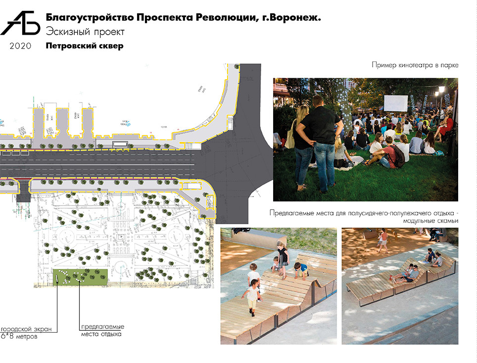 Для создания уличного кинотеатра предложена площадка в Петровском сквере с размещением модульных малых архитектурных форм.– Все мы понимаем, что требуются очень большие деньги и без четкой разбивки на этапы мы такой проект не реализуем. По сравнению с первоначальным проектом, прогресс налицо. Теперь необходимо тщательно продумать очередность реализации проекта, – подчеркнул глава Воронежа Вадим Кстенин по итогам доклада.Обсуждался вариант трехгодичной реализации проекта: первый – перекладка сетей и обустройство тротуара по одной стороне, следующий – вторая сторона пешеходной части проспекта, финальная часть – установка малых архитектурных форм и иные работы, которые не являются первоочередными.