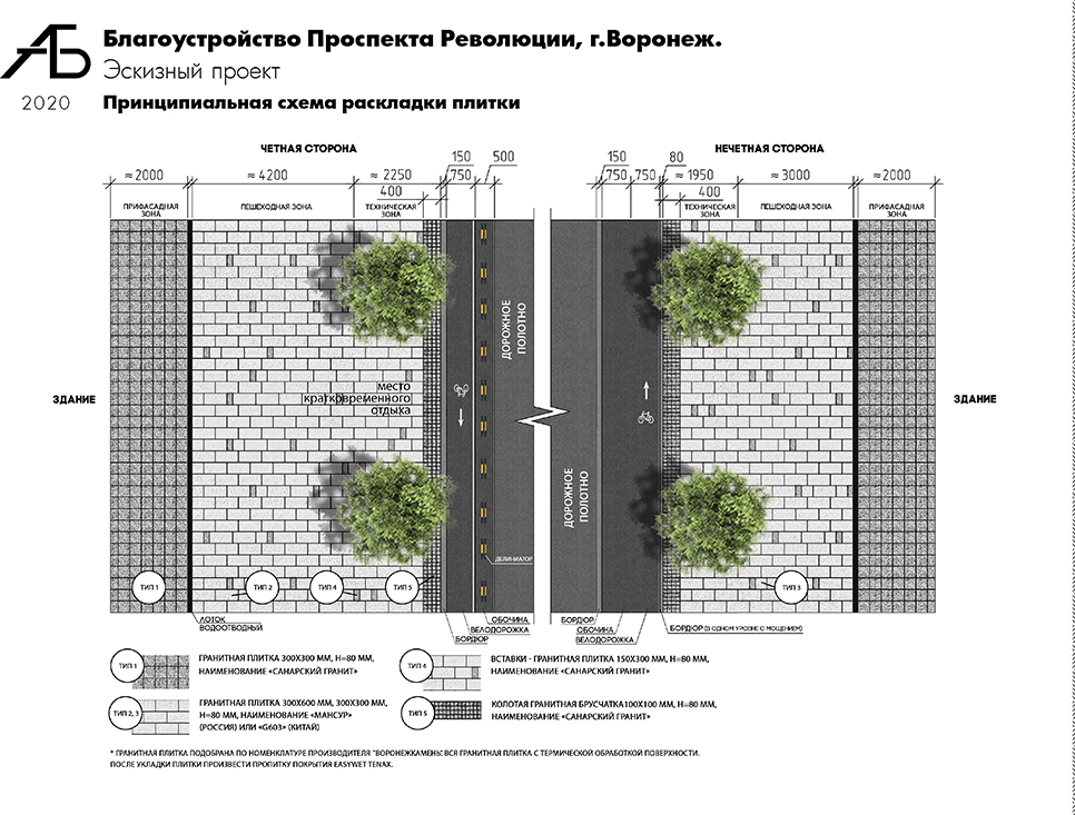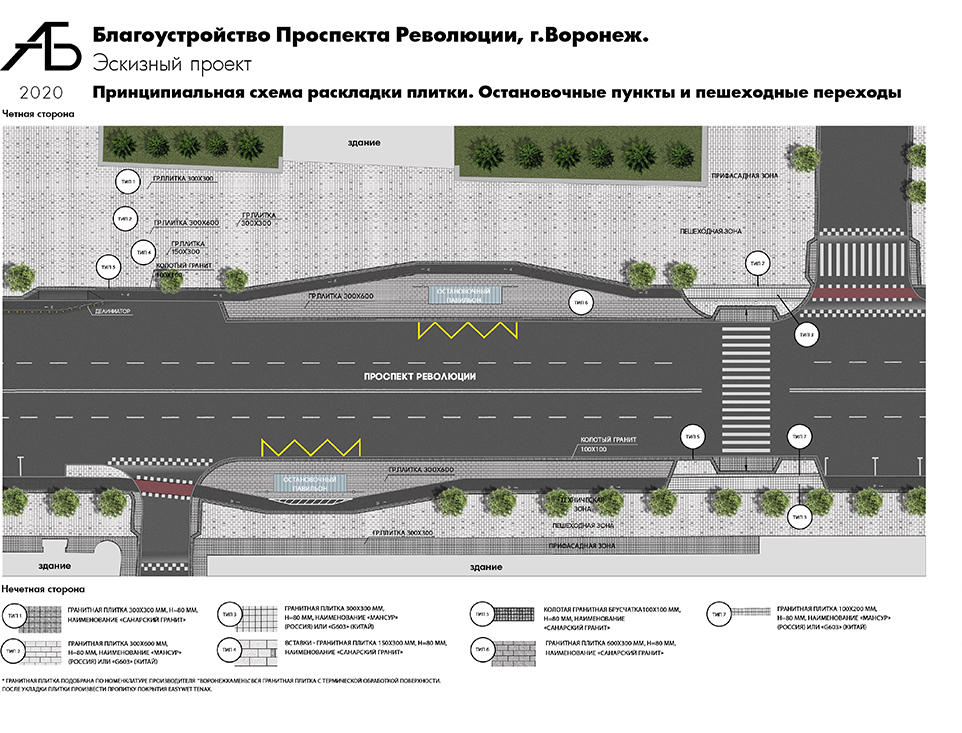 – В качестве материала мощения выбран гранит двух видов. Его внешний вид обеспечивает акцент на фасады здания и элементы благоустройства, визуально расширяет пространство. Многие здания по проспекту имеют серый цоколь и будут сочетаться с мощением прифасадой зоны. Форматы мощения также подобраны исходя из функциональных зон тротуара, предусмотрено предупреждающее мощение из колотого гранита вместо тактильной плитки. На стыке транзитной и прифасадной зоны будут установлены водоотводные лотки из полимербетона, которые окрасят в цвет прифасадной зоны. Подобранные варианты учитывают требования по прочности гранита, - рассказала Екатерина Белоус.