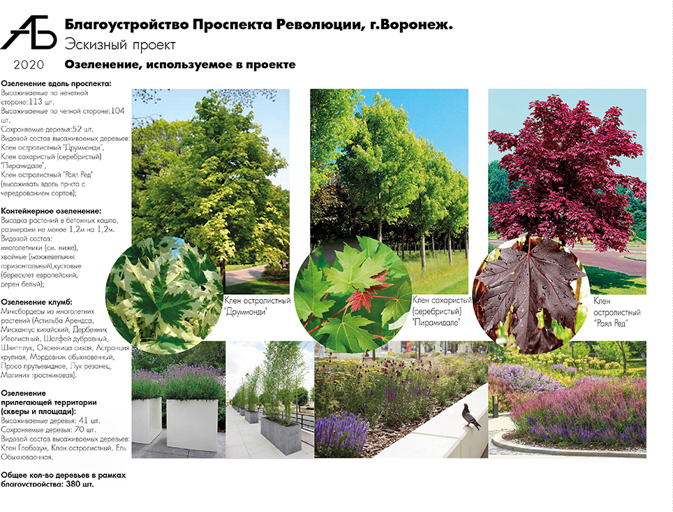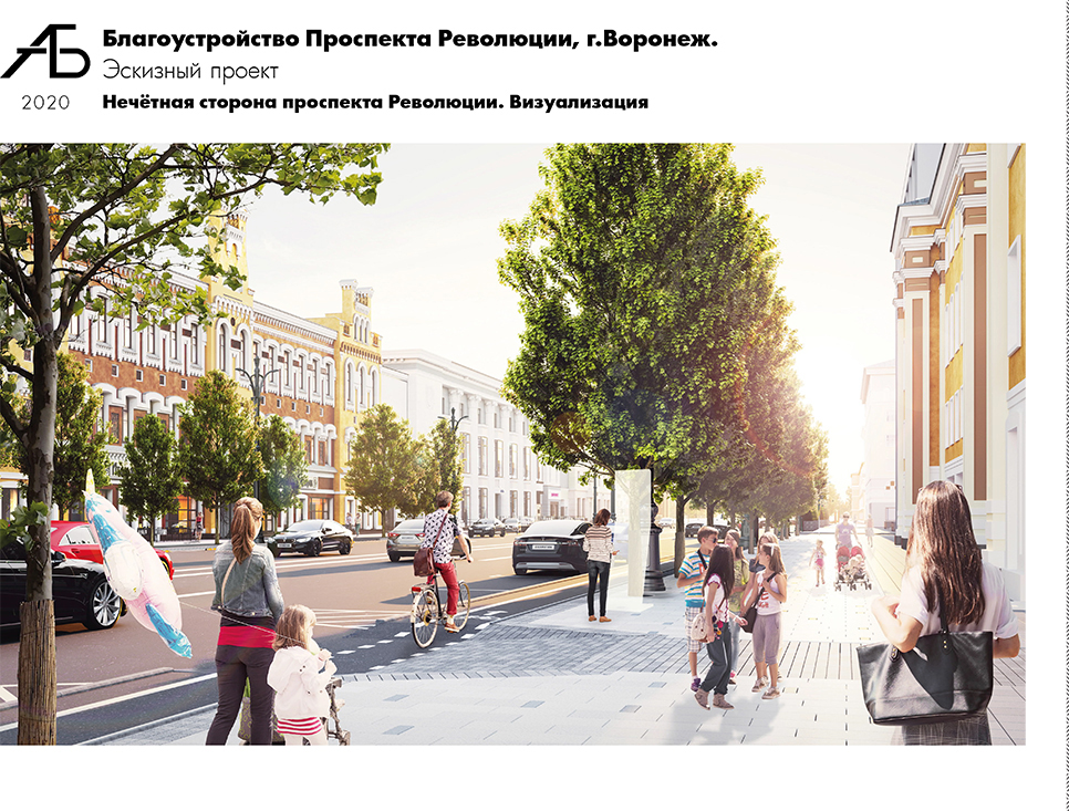 Отдельно остановились на теме озеленения проспекта. Проектом предусмотрена высадка новых 217 деревьев вдоль улицы и сохранение 52 деревьев. Озеленение представлено несколькими сортами кленов, адаптированных к городской среде. Высадка деревьев спроектирована с учетом велодорожки, «шага» между деревьями, размещения инженерных сетей и колодцев, опор освещения, приствольных решеток, колодцев кабельной канализации. В местах, где посадка деревьев невозможна, предлагается контейнерное озеленение. Также в проекте заложено дополнительное озеленение прилегающих территорий с высадкой 41 дерева различных пород.При разработке проекта стояла и задача обустроить прилегающие территории в соответствии с функциональными зонами, предлагаемыми общественниками и жителями города.