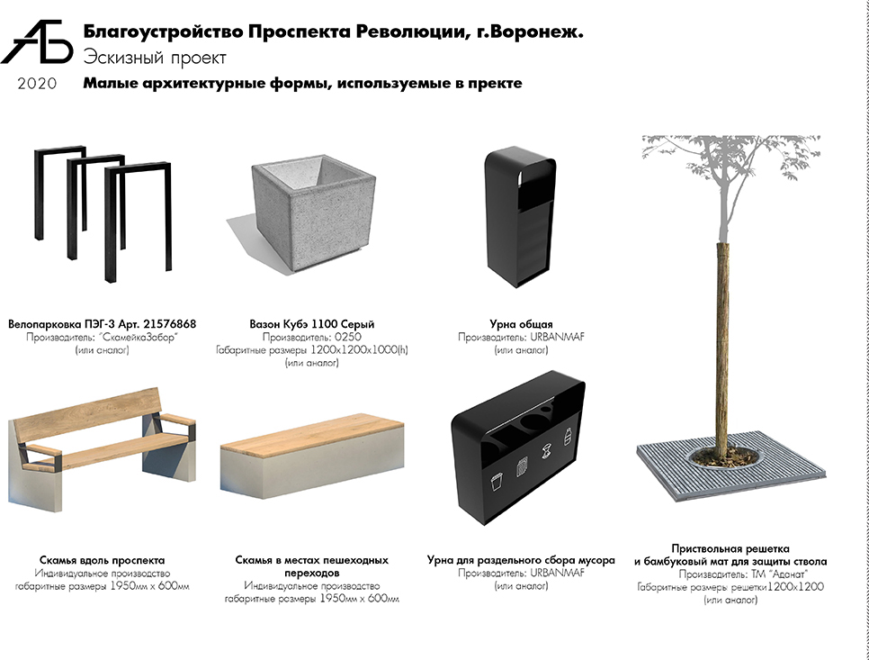 Приствольные решетки предложено выполнить с мелкой ячейкой без перепада высот, в одном уровне с мощением. Для защиты стволов деревьев было принято решение использовать бамбуковые маты, которые выглядят визуально легче и не занимают дополнительное пространство. Урны выбраны простой формы, контрастные по цвету к мощению – это рекомендация РУРЦ «Доступная среда»: для того, чтобы урны были заметны слабовидящим людям.