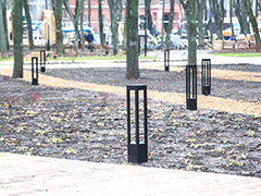 Интересное решение парка вдоль зоны фудкорта – авторское дизайнерское мощение, которое окружает пешеходный мост. Там применена необычная форма плитки, которая за счет отсутствия бордюрного камня позволяет живописно входить мощением в зеленую зону. Второе интересное мощение в парке – дорожки внутри детской зоны. Они имеют необычный поперечный профиль и сделаны для того, чтобы сыпучее покрытие детской территории меньше попадало на дорожку.На территории мемориального комплекса выполнена облицовка подпорных стен, заменено мощение, отремонтированы старинные фонари. Раритетные светильники будут перекликаться с современными элементами освещения бионической формы (в виде листьев).