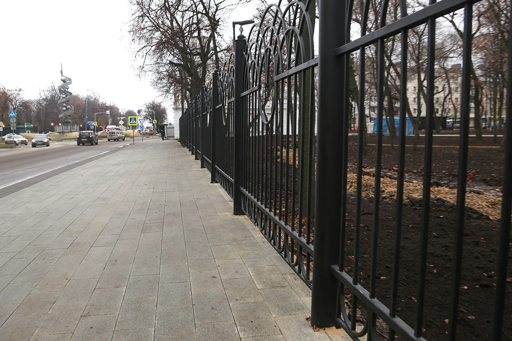 В парке обновлено ограждение: утраченные элементы воссозданы, полностью заменено основание. По периметру парка силами управы Центрального района завершается замена плиточного мощения, которое по формату соответствует стилистике парка. Планируется установка приствольных решеток тоже в единой стилистике с парком. Территория вокруг парка выполнена в соответствии с требованиями безбарьерной среды (с необходимыми понижениями и техническими зонами из мелкой брусчатки).