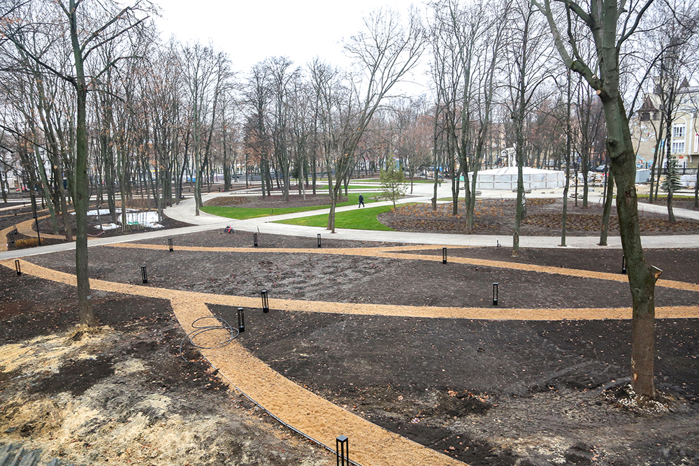 Интересное решение парка вдоль зоны фудкорта – авторское дизайнерское мощение, которое окружает пешеходный мост. Там применена необычная форма плитки, которая за счет отсутствия бордюрного камня позволяет живописно входить мощением в зеленую зону. Второе интересное мощение в парке – дорожки внутри детской зоны. Они имеют необычный поперечный профиль и сделаны для того, чтобы сыпучее покрытие детской территории меньше попадало на дорожку.На территории мемориального комплекса выполнена облицовка подпорных стен, заменено мощение, отремонтированы старинные фонари. Раритетные светильники будут перекликаться с современными элементами освещения бионической формы (в виде листьев).