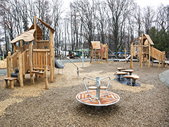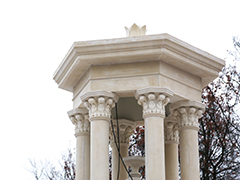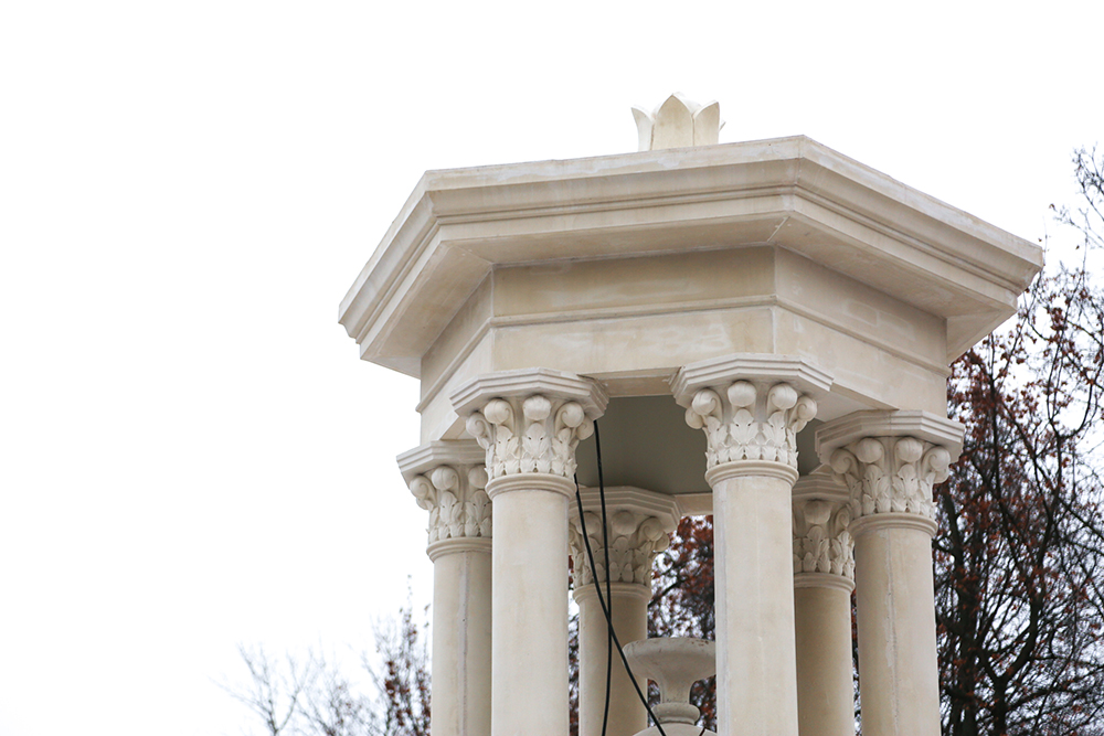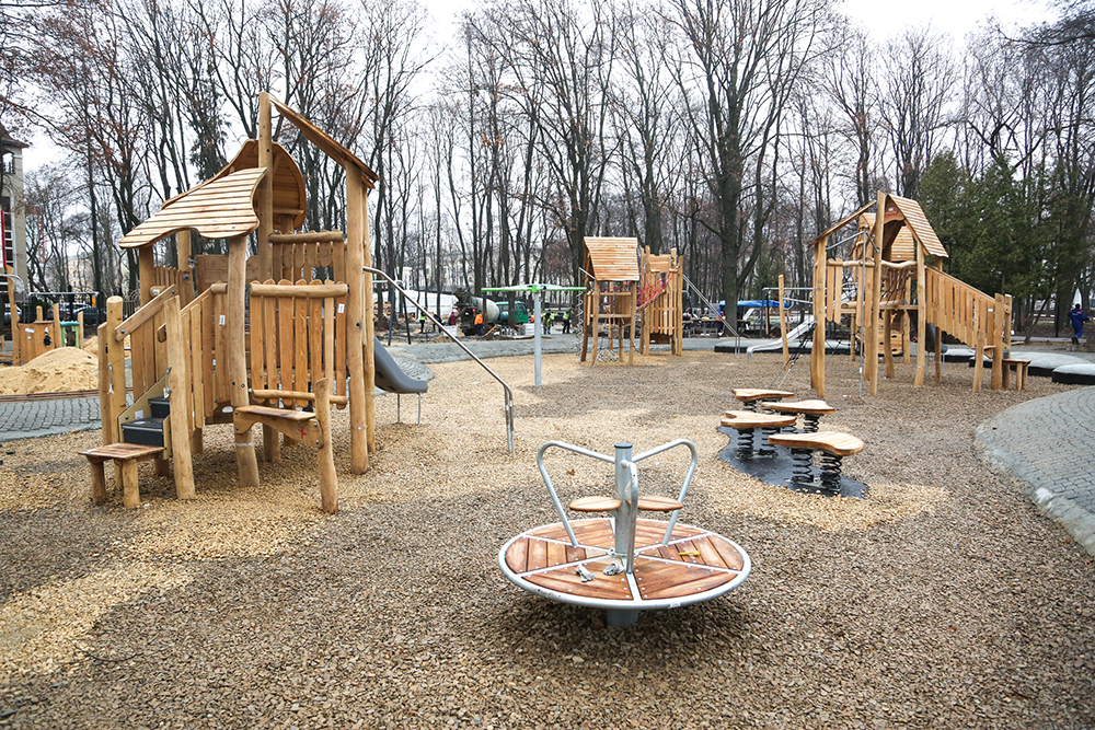 На территории детской зоны подготовлены все основания и установлено оборудование, а финальная отсыпка покрытия будет произведена весной. По слепкам были воссозданы элементы главной входной группы: получили свой первозданный облик русты, лепнина, капители. Особая гордость – возвращены утраченные базы колонн (раньше колонны имела капители и базы), до начала благоустройства территории колонны опирались на основание входной группы, концепцией и проектом было предусмотрено восставленные утраченных элементов.