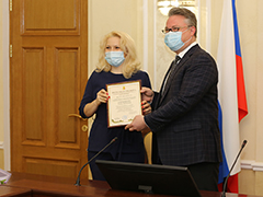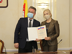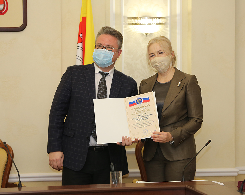 Почетные грамоты администрации и благодарности главы городского округа из рук Вадима Кстенина получили десять сотрудников палаты во главе с ее председателем Еленой Литвинчук.В ответном слове Елена Станиславовна поблагодарила главу города за высокий уровень взаимодействия и вручила ему Почетный знак «За заслуги в укреплении сотрудничества с контрольно-счетной палатой Воронежа» и удостоверение к нему. Такой же награды удостоена Марина Плиева – заместитель главы администрации - полномочный представитель главы городского округа в городской Думе.