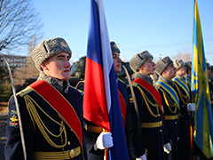 В завершении церемонии оркестр исполнил гимн Российской Федерации, а почетный караул прошел торжественным маршем.