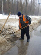 На тротуарах работает техника малой механизации, которая благодаря своим скромным габаритам позволяет очистить труднодоступные места. Одновременно ведется работа по обработке территории противогололедными материалами. С начала зимнего периода было израсходовано 13 835 тонн песко-соляной смеси и вывезено 30 055 куб. м. снега.В результате резкой перемены температуры воздуха «зоной риска» с точки зрения образования сосулек являются не только многоквартирные дома, козырьки подъездов, входные группы организаций, остановочные навесы, но и путепроводы. Неизбежно наступает момент, когда масса образования наледи становится критической и от вибраций или плюсовой температуры может упасть на проезжую часть и на крыши машин, создавая аварийную ситуацию на дороге. В связи с этим сотрудники комбината благоустройства принимают своевременные меры к приведению мостов в безопасное состояние.