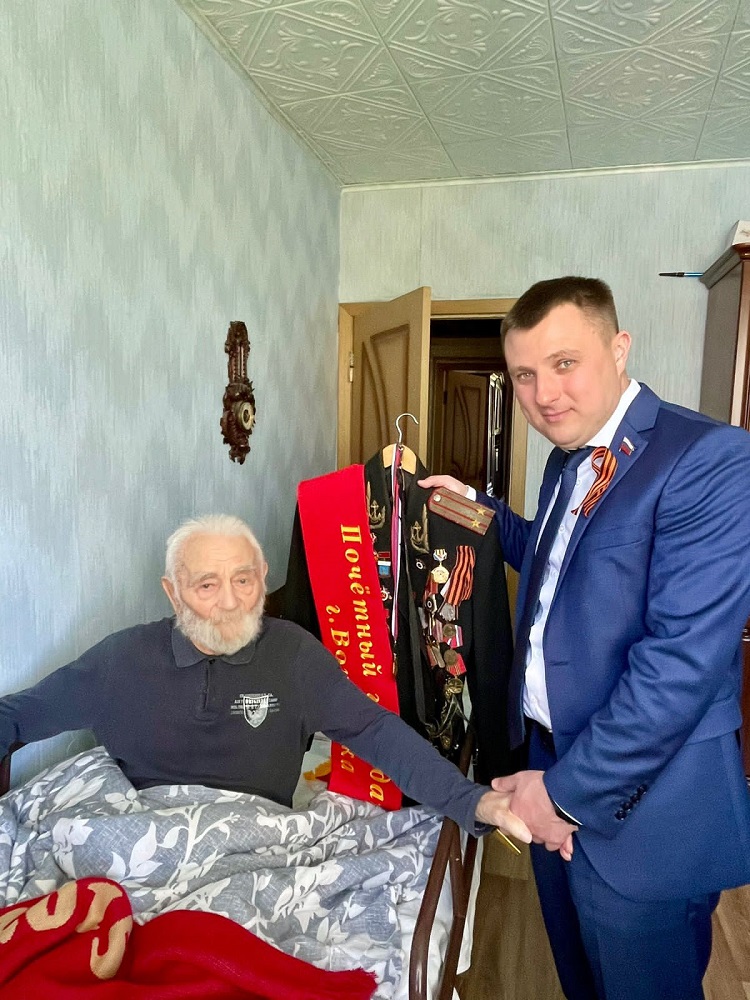 - В последние несколько лет управа района совместно с творческой общественностью, учреждениями образования организует музыкальные поздравления участников Великой Отечественной войны. В этом году мы также посетили героев с поздравлениями, а эстрадно-духовой оркестр «Акцент» Центра развития творчества детей и юношества исполнил перед ними знаменитые композиции времен войны и победные марши, - сказал глава Ленинского района Сергей Ситников.Егор Дмитриевич Кудинов – ему 97 лет, рассказывает, в школе учился на отлично, хотя доучиться не удалось, началась война. С 17 лет в Красной Армии. Служил прожектористом в 12- ом прожекторном полку затем в 57-ом зенитно-артиллерийском полку, зенитчиком. Защищал Москву. За свои подвиги имеет боевые награды. После войны прошел славный трудовой путь. А вот Пелагее Власовне Кисленко в 2022 году исполниться 100 лет. Ее славная боевая и трудовая биография тоже достойна восхищения. В свое время отважный санинструктор спасла не одну жизнь красноармецев, вынося их с поля боя.