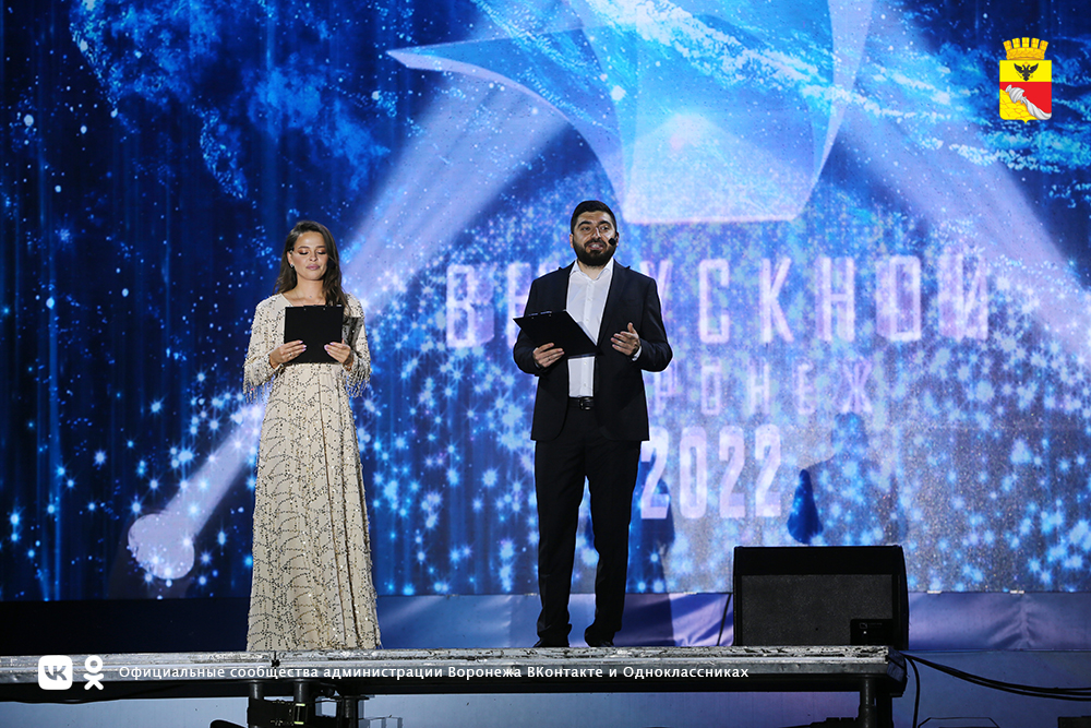 Нежная музыка сменяется фанфарами - на сцену под радостный гул юношей и девушек выходят ведущие выпускного бала-2022. В этом году это актриса театра драмы им. Кольцова Екатерина Марсальская и резидент шоу «Стендап», блогер Роман Косицын.Поприветствовав выпускников под громкие овации юношей и девушек, они напомнили им некоторые цитаты Маленького принца о главных жизненных ценностях, что зорко одно лишь сердце, и самого главного глазами не увидишь, что звезды светятся затем, чтобы рано или поздно каждый мог вновь отыскать свою.