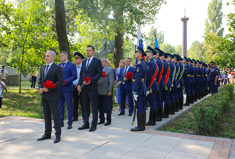 В церемонии возложения венков и цветов к Вечному огню на Аллее Героев приняли участие глава города Вадим Кстенин, представители правительства Воронежской области, областной и городской дум, правоохранительных органов, силовых структур и ветеранских организаций. На мемориальном комплексе священнослужители Воронежской епархии провели траурную панихиду, военный оркестр исполнил гимн Российской Федерации, а почетный караул прошел торжественным маршем.
