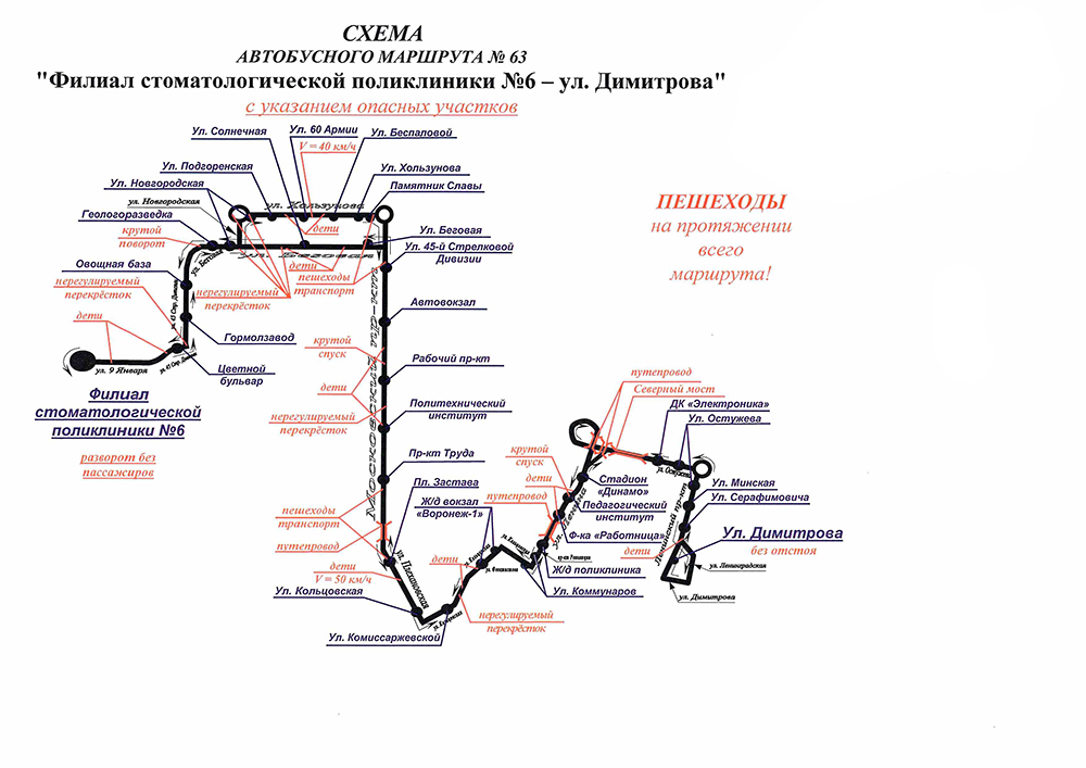 Маршрут № 63 сократится в левобережной части города ввиду того, что условия организации остановки «Нефтебаза» не предполагают обслуживание автобусами большого класса. Движение техники будет направлено от остановки «Филиал стоматологической поликлиники № 6» по улицам 9 Января, 45-й Стрелковой дивизии, Беговой, Новгородской, Хользунова, Московскому проспекту, улицам Плехановской, Кольцовской, проспекту Революции, улице Ленина, Северному мосту, улице Остужева, Ленинскому проспекту, улицам Ленинградской, Димитрова, Ленинскому проспекту до остановки «ул. Димитрова». В обратном направлении – по Ленинскому проспекту, улице Остужева, Северному мосту, улице Ленина, проспекту Революции, улицам Кольцовской, Плехановской, Московскому проспекту, улицам Беговой, 45-й Стрелковой дивизии, 9 Января.