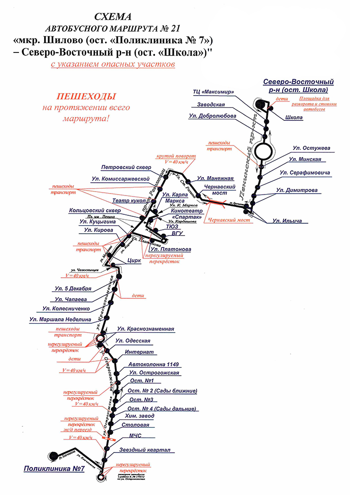 Для обеспечения связи мкр. Шилово с центральной частью города по обращениям горожан маршрут № 21 перенаправлен с ВоГРЭСовского моста на Чернавский.Автобусы проследуют от остановки «Поликлиника № 7» по улицам Ключникова, Острогожской, Краснознаменной, Челюскинцев, Моисеева, Кирова, Платонова, Университетской площади, улице Плехановской, площади Ленина, улицам Кардашова, Карла Маркса, проспекту Революции, улице Степана Разина, Чернавскому мосту, Ленинскому проспекту до остановки «Школа». В обратном направлении – по Ленинскому проспекту, улице Брусилова, Чернавскому мосту, улице Степана Разина, проспекту Революции, площади Ленина, улицам Кирова, Моисеева, Челюскинцев, Краснознаменной, Острогожской, Ключникова.