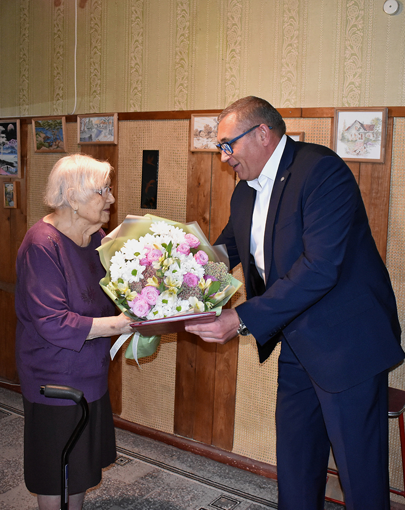 Сергей Ситников вручил юбиляру букет цветов от имени главы города Воронежа Вадима Кстенина и подарки от управы района.