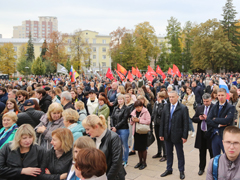 На сооруженной перед Концертным залом сцене выступали общественные деятели, солисты и творческие коллективы: мужской хор «ART’o’dox», ансамбль «Здравица», фолк-группа «Ярилов зной» и другие. Под крики горожан «Ура!» и «Победа будет за нами» с приветственным словом к ним обратился руководитель регионального исполкома Общероссийского народного фронта Александр Гончаров.