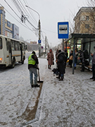 Ведутся работы по посыпке противогололедным материалом улично-дорожной сети и тротуарной части, очистка остановочных павильонов и пешеходных переходов, а также подходов к ним.