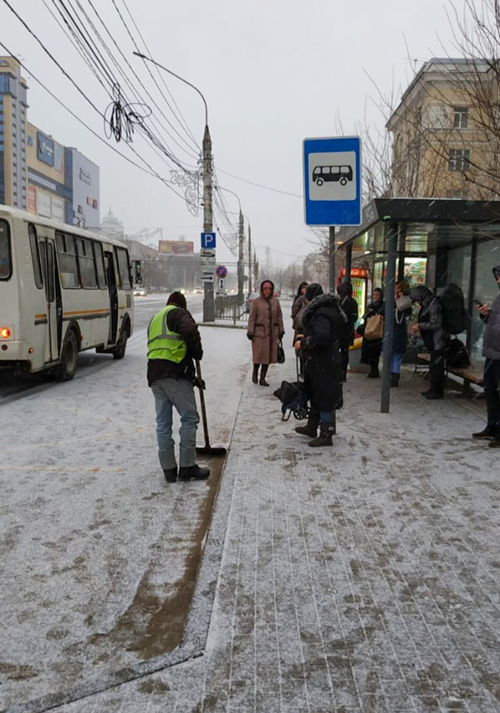 Ведутся работы по посыпке противогололедным материалом улично-дорожной сети и тротуарной части, очистка остановочных павильонов и пешеходных переходов, а также подходов к ним.