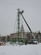 Несколько дней назад в центре города началась сборка новогодней красавицы. В этом году на площади Ленина появится ствольная 21-метровая ель. Она состоит из прочной металлической основы и веток, расходящихся на концах в «еловые лапы».