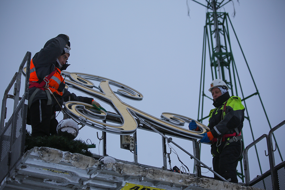 Вечером 9 декабря специалисты фирмы-подрядчика, которая занимается украшением площади Ленина к новогодним и рождественским праздникам, протестировали работу вензеля Петра I.Именно он в этом году разместится на верхушке ели вместо традиционной звезды. Высота вензеля больше 2 метров. Внешний вид разработан специалистами фирмы-подрядчика совместно с компанией, которая занималась производством новогоднего дерева. Он полностью вырезан на станках в воронежских цехах.