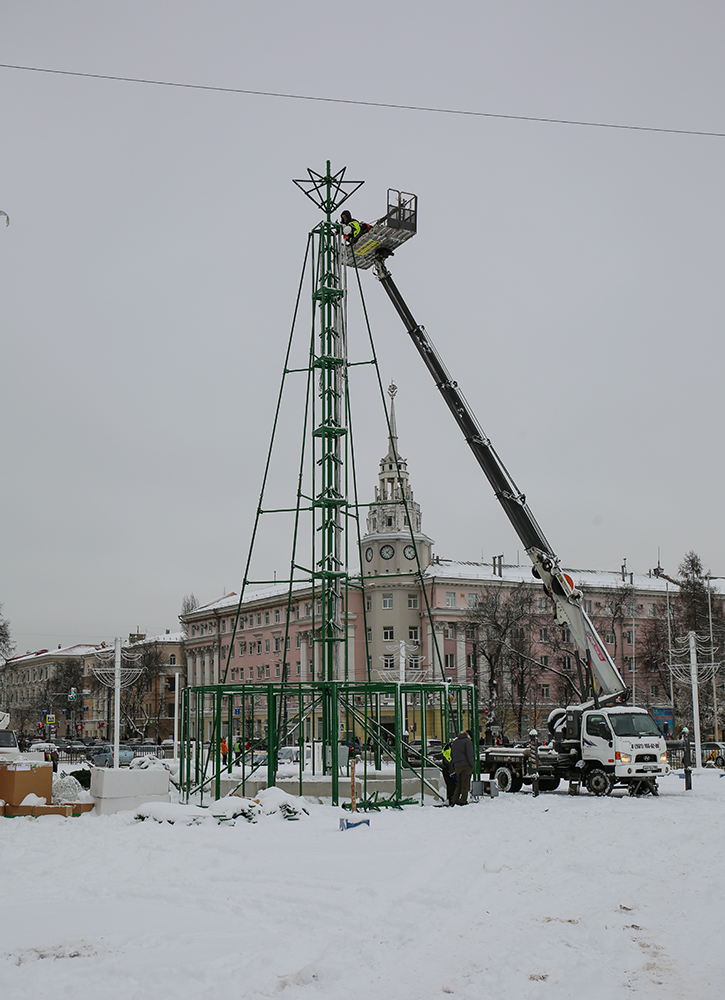 Несколько дней назад в центре города началась сборка новогодней красавицы. В этом году на площади Ленина появится ствольная 21-метровая ель. Она состоит из прочной металлической основы и веток, расходящихся на концах в «еловые лапы».
