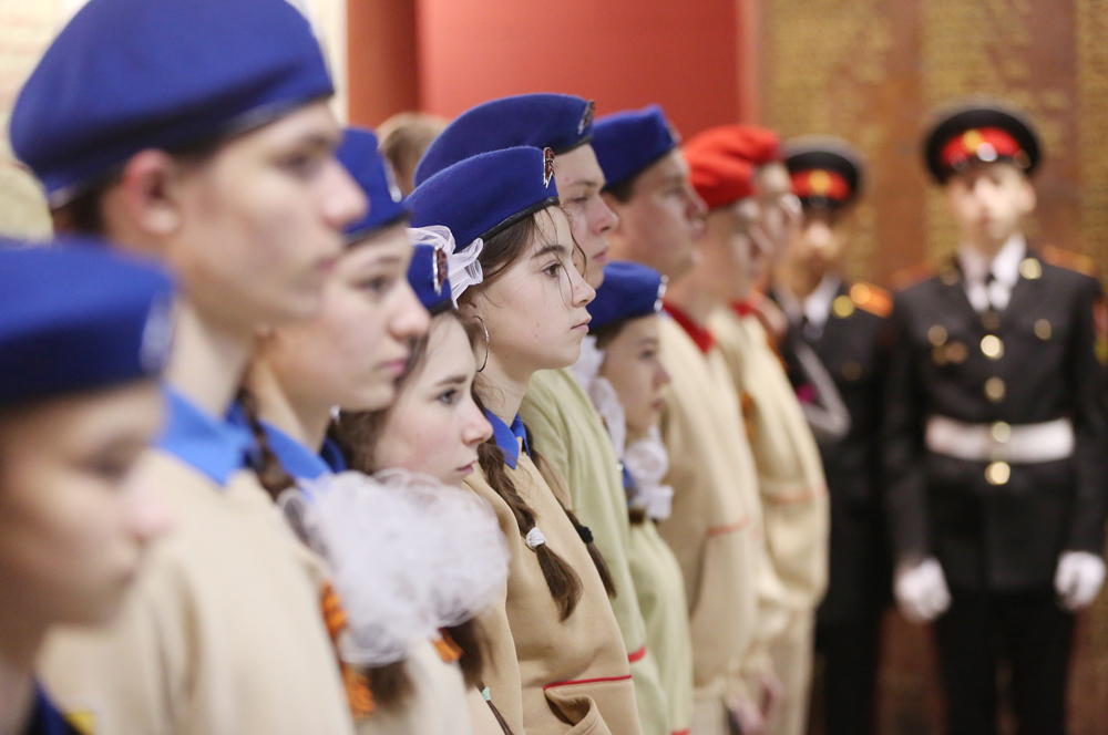Началось мероприятие на площадке перед мемориальный комплексом – здесь ребята возложили венки и цветы к памятнику «Клятва-салют» и братской могиле. Далее действие перенеслось в Зал Памяти.