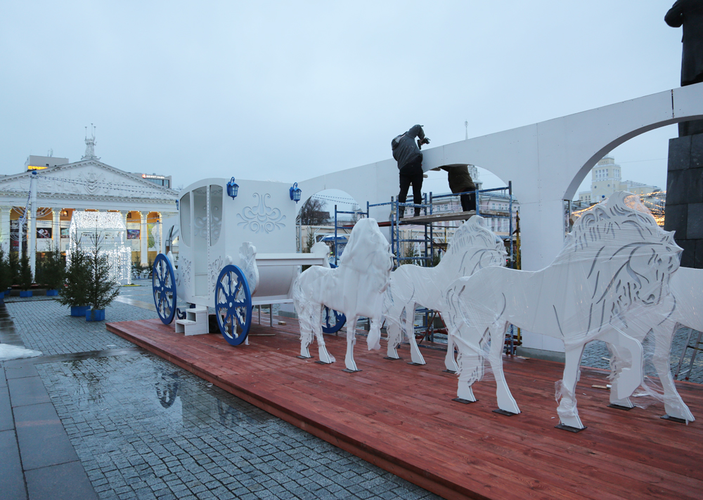 В Воронеже по решению федерального оргкомитета проходят мероприятия, посвященные 350-летию императора Петра I. Поэтому главная площадь города в этом году украшается в этой тематике.Напомним, что в рамках утвержденной концепции фирмой-подрядчиком будут установлены более 400 различных конструкций, составляющих новогоднее оформление площади – от многотонных бетонных тумб-подставок до огромной 3,5 метровой императорской кареты, запряженной четырьмя лошадьми. Кстати, объект уже находится на площади. Сейчас специалисты заканчивают работы по монтажу его подсветки. Интересно, что в 1724 году состоялось венчание на трон супруги Петра I. Именно для этого торжества царем и была заказана большая коронационная карета. Она была выполнена из дерева, украшена резьбой и росписью. Работу выполняли французы – мануфактура Гобеленов. После этого появилась новая традиция, введённая Петром Великим - торжественные события, посвященные коронации всех представителей династии Романовых, проходили с участием этой кареты.