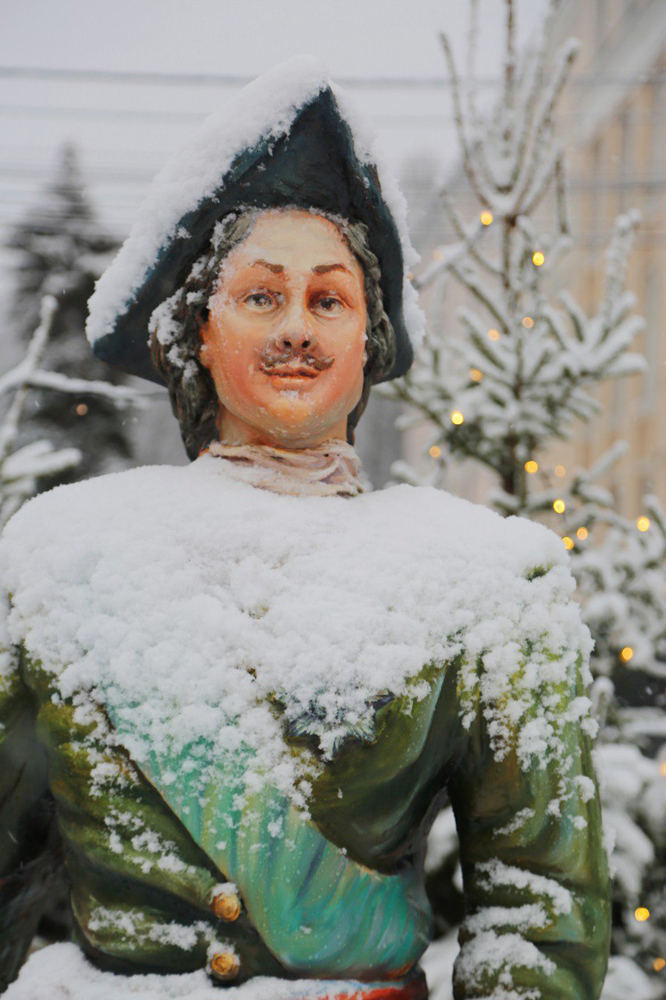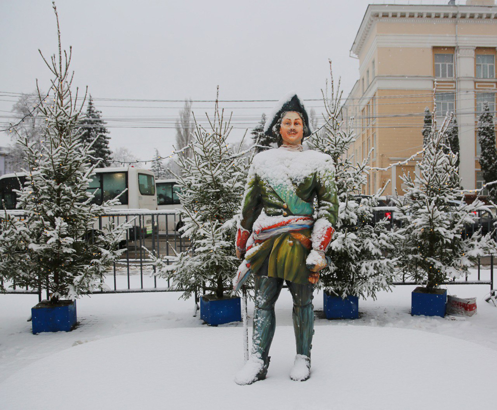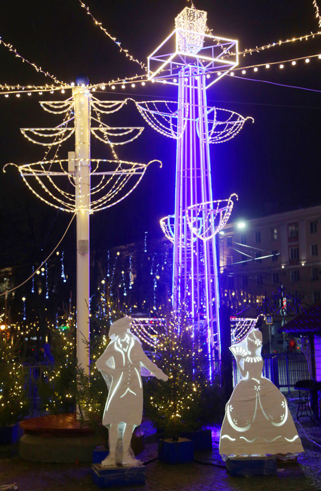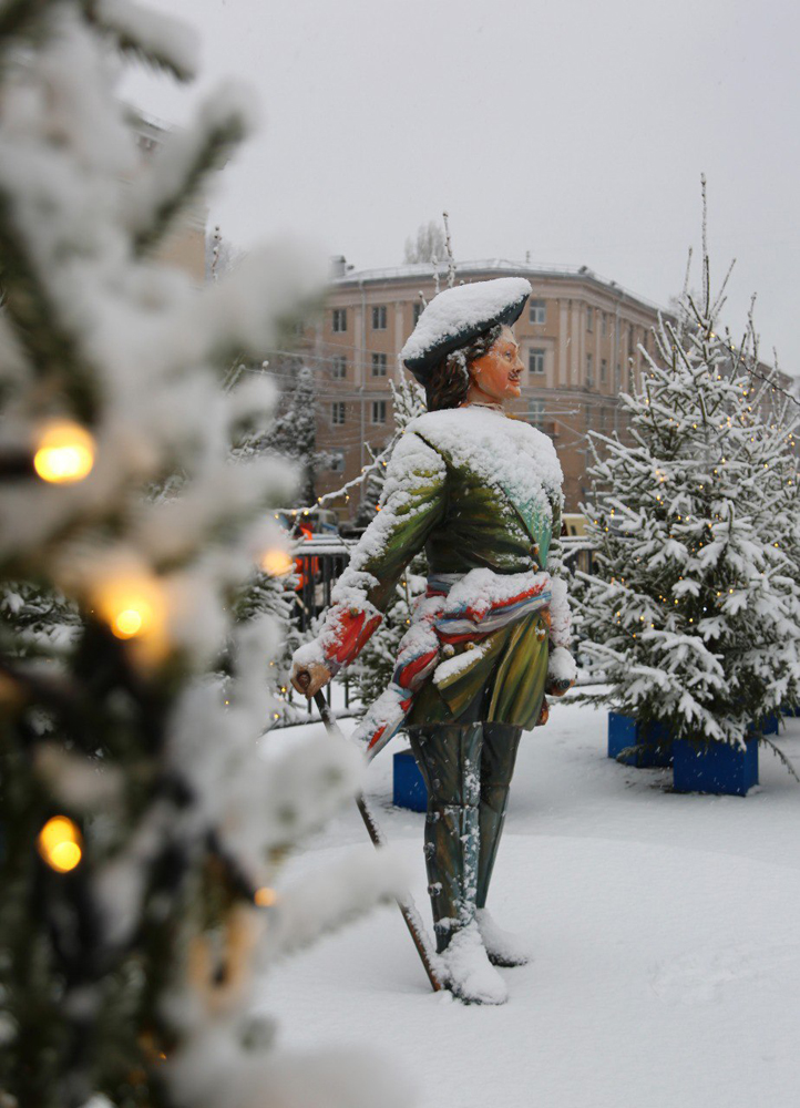 Праздничное оформление площади Ленина выдержано в стилистике петровских времен, поскольку 2022 год в стране объявлен годом 350-летия со дня рождения Петра Великого. Конструкции включают в себя новую общегородскую новогоднюю ель с вензелем императора и огромным светящимся шатром, две масштабные входные группы в виде Кикиных палат – памятника архитектуры петровского барокко, карусель для детей, качели разных видов, множество украшений и фотозон: карета, запряженная четверкой лошадей, ростральные колонны, двухметровая фигура молодого и веселого императора, светящиеся фигуры дам и кавалеров, интересные арочные конструкции.