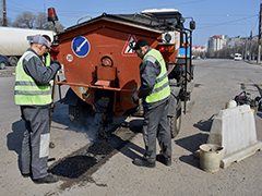 С наступлением теплой и сухой погоды вместо литой асфальтобетонной смеси, позволяющей работать в условиях высокой влажности и при пониженной температуре, комбинат начнет применять способ ямочного ремонта с помощью машины БЦМ.
