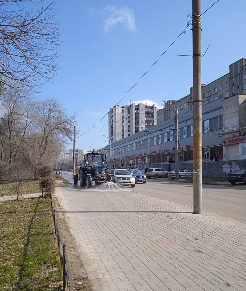 Водные процедуры традиционно проводятся в конце марта, когда стабильно устанавливаются плюсовые температуры. Уборка от смета, песка и прочего мусора ведется с помощью поливомоечных машин, погрузчиков, подметально-уборочных машин, тракторов-щеток, комбинированных машин и грузовиков. Мойка под высоким давлением воды проводится с помощью специального оборудования, установленного на комбинированных дорожных машинах. Главная задача – «умыть» район, очистить от неприятных последствий зимы.Ежедневно подметание, мойку проезжей части, магистралей, улиц, проездов, прилотковых зон, тротуаров, осуществляет порядка 25 единиц спецтехники и около 70 работников ручной уборки.