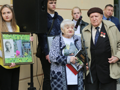 Каждый год на месте трагедии бывает и еще один очевидец Митрофан Москалев. Он находился на месте бомбежки вражеской авиацией городского Сада Пионеров и чудом остался жив. Будучи еще подростком, защищал Воронеж – гасил зажигательные мины, а после освобождения – разминировал родной город. Ранее Митрофан Федорович был награжден памятным знаком «Воронеж - город воинской славы». Он поделился своими воспоминаниями с собравшимися.Участники театральной студии «Марьина Роща» из клуба «Придонской» прочитали трогательное стихотворение «Это мы..», автором которого стала их руководитель Мария Синельникова, посвященное детям войны, а воспитанники вокальной студии гимназии №1 исполнили композицию «Аист на крыше».