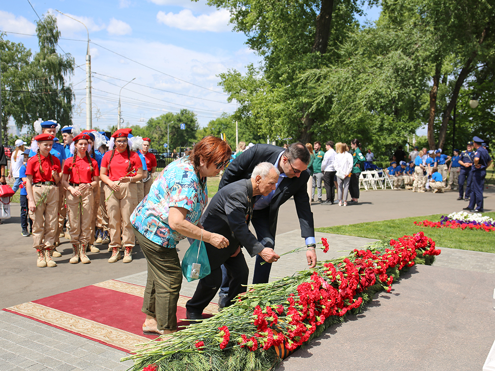 Ведущие церемонии - заместитель директора городского дворца культуры Ирина Черникова и курсовой офицер Военно-воздушной академии лейтенант Александр Макаров - напомнили собравшимся о страшном утре 22 июня 1941 года, о 1418 днях и ночах, когда шли кровопролитные бои, о 27 миллионах советских граждан, погибших на фронтах, в немецком плену, умерших от голода и бомбёжек, в гетто и печах нацистских лагерей смерти, о 1710 разрушенных городах и поселках, 70 тыс. сел и деревень.