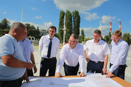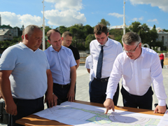 Мэр еще раз обратил внимание на сохранение зеленых насаждений и ответственности за повреждение деревьев.Далее обсудили работы в районе Чернавского моста, где расположена входная группа «Петровская набережная». Сейчас там идет монтаж основания под стенд с подсветкой и причала «Чернавский».