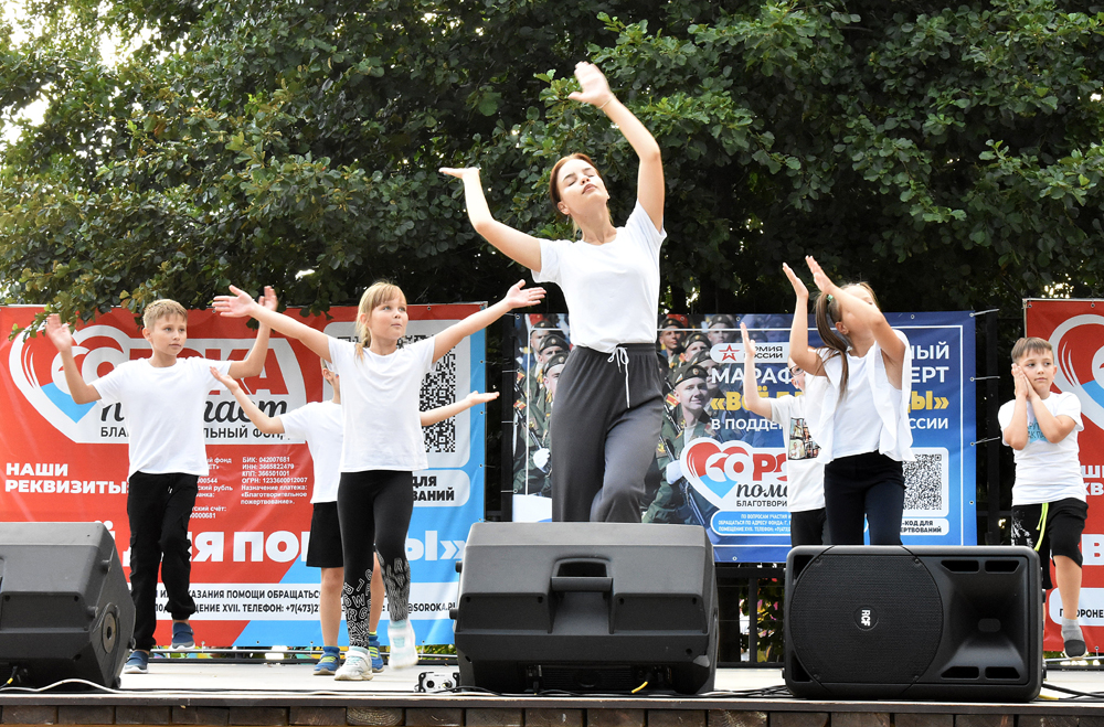 27 августа в smart-парке «Дельфин» прошел народный марафон – концерт «Все для Победы!», организованный Благотворительным фондом «Сорока помогает» при поддержке регионального Правительства и управы Ленинского района Воронежа. В мероприятии, направленном на поддержку Российской Армии, приняли участие многочисленные творческие коллективы из разных районов Воронежской области. Среди них известные ансамбли из Таловского района «Дива» и «Надежда», знаменитый казачий ансамбль «Багатица» и женский ансамбль «Сударушка» из Семилукского района, солисты из общеобразовательной школы № 13, танцевальный коллектив творческого детского центра «Семья научит» под руководством Натальи Давыдовой.