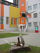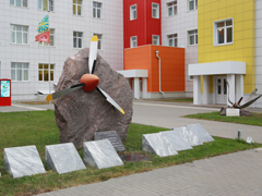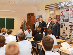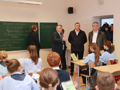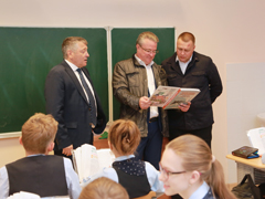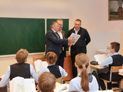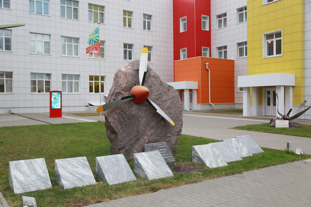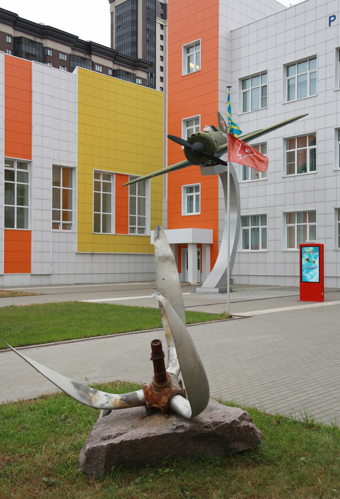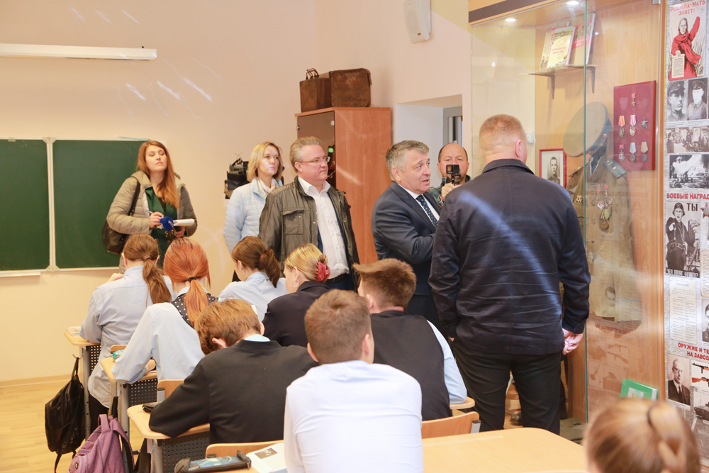 Экскурсия по школе, которую для гостей провел ее директор Алексей Фактор, началась у открытого в прошлом году монумента – стоящего перед школой самолета И-16, на котором летал героически погибший в Великую Отечественную войну лётчик Алексей Небольсин.