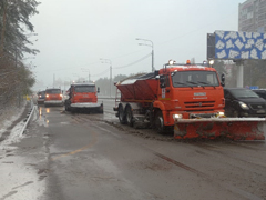 В дневную смену комбинат благоустройства очистил и обработал реагентом остановки общественного транспорта, спуски, подъемы, транспортные развязки.