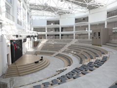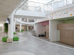 Осмотр образовательного гиганта начали с его сердца – светлого и просторного атриума. Именно здесь, по словам директора школы Ольги Струковой, с церемонии поднятия флагов стартует учебная неделя. Тут же проходит отдых детей между уроками и после них, а также ключевые мероприятия «Содружества».