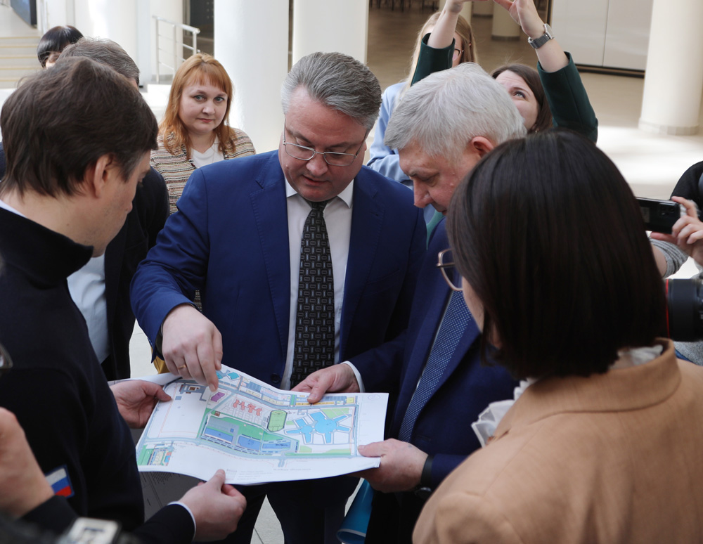 Мэр Вадим Кстенин поделился с министром просвещения России Сергеем Кравцовым планами развития соцузла у мегашколы