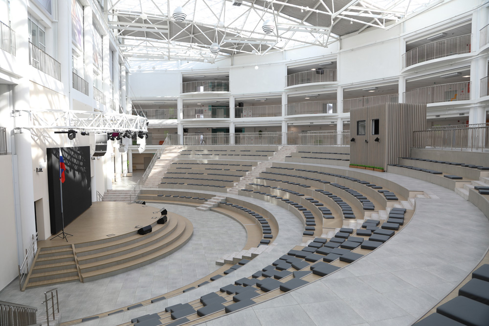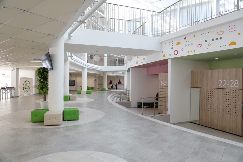 Осмотр образовательного гиганта начали с его сердца – светлого и просторного атриума. Именно здесь, по словам директора школы Ольги Струковой, с церемонии поднятия флагов стартует учебная неделя. Тут же проходит отдых детей между уроками и после них, а также ключевые мероприятия «Содружества».