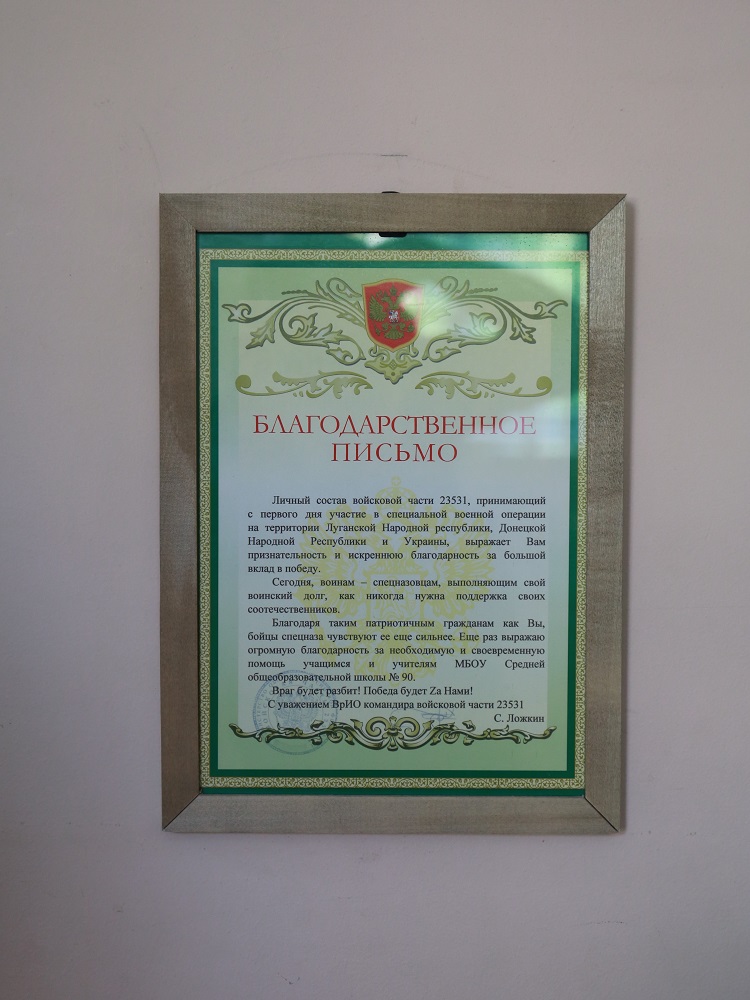 Директор образовательного учреждения Сергей Пышнограев рассказал, что идея музея, посвященного специальной военной операции, появилась в конце прошлого года, когда ученики и педагоги стали активно собирать гуманитарную помощь и передавать ее волонтёрам для отправки в зону боевых действий. – Мы собирали самое необходимое: продукты, одежду теплую, медикаменты, дополнительно дети неоднократно писали письма бойцам в зону СВО, рисовали открытки, плакаты поздравительные. Командование оценило, и нам было прислано несколько благодарственных писем от командиров частей. Одно из писем висит среди прочих наших грамот – это очень важно для понимания значимости нашей работы и многие классы просят, чтобы мы организовывали встречу с участниками, ветеранами СВО. Естественно, мы идем на встречу, потому что это важно для патриотического воспитания наших будущих граждан, – говорит Сергей Пышнограев.Однако в учреждении стали появляться не только благодарности командования, но и различные трофеи, которые волонтеры привозили с фронта и передавали их в школу. Ряд из них был передан председателем Совета отцов Воронежской области Андреем Згонниковым, при участии которого и был создан музей не только в СОШ №90, но и в еще нескольких учреждениях.