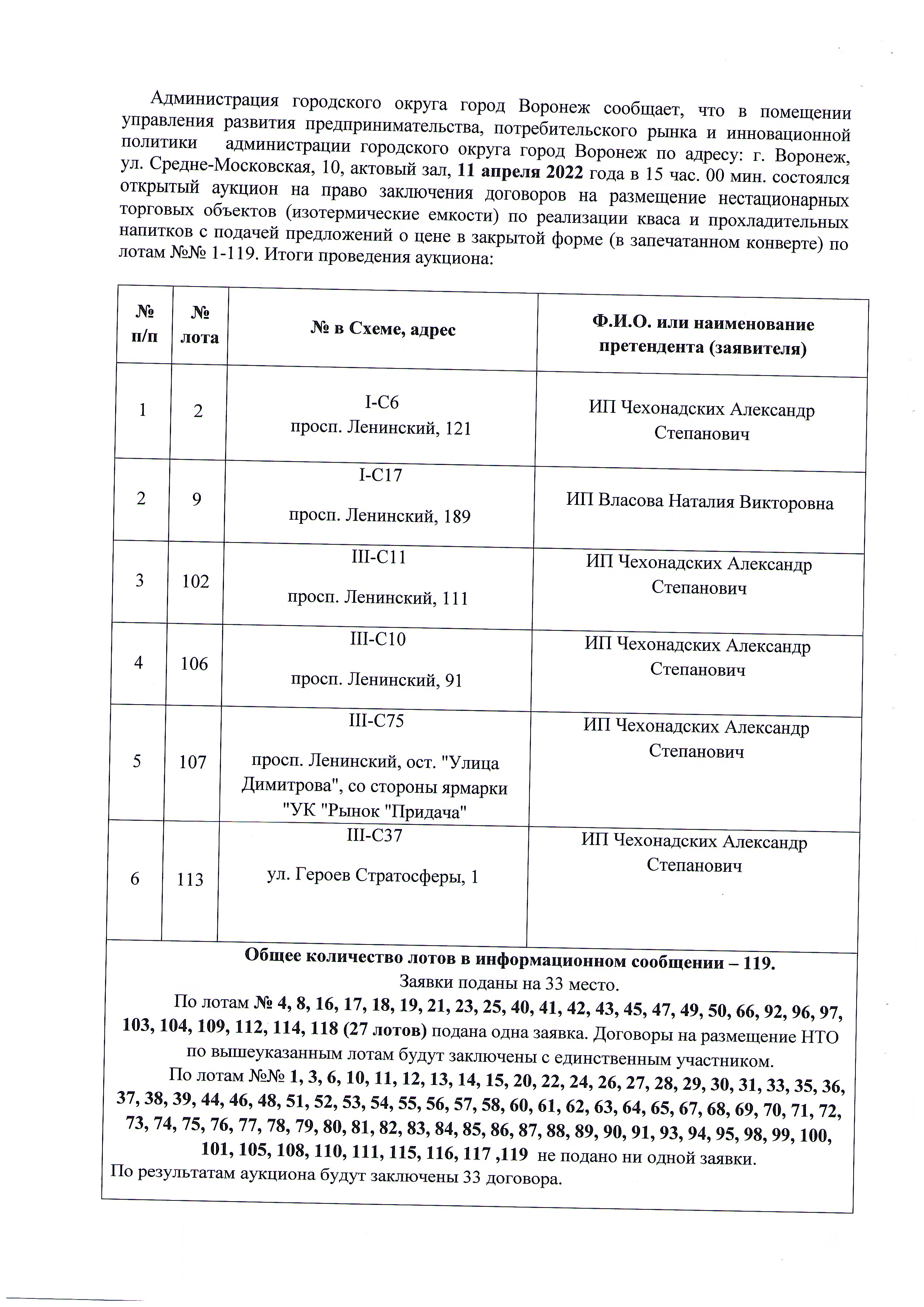 ИНФОРМАЦИОННОЕ СООБЩЕНИЕАдминистрация городского округа город Воронеж сообщает, что в помещении управления развития предпринимательства, потребительского рынка и инновационной политики администрации городского округа город Воронеж по адресу: г. Воронеж, ул. Средне-Московская, 10, актовый зал, 18 апреля 2022 года в 15 час. 00 мин. состоялся открытый аукцион на право заключения договоров на размещение нестационарных торговых объектов (изотермические емкости) по реализации кваса и прохладительных напитков с подачей предложений о цене в закрытой форме (в запечатанном конверте) по лотам №№ 1-119. -