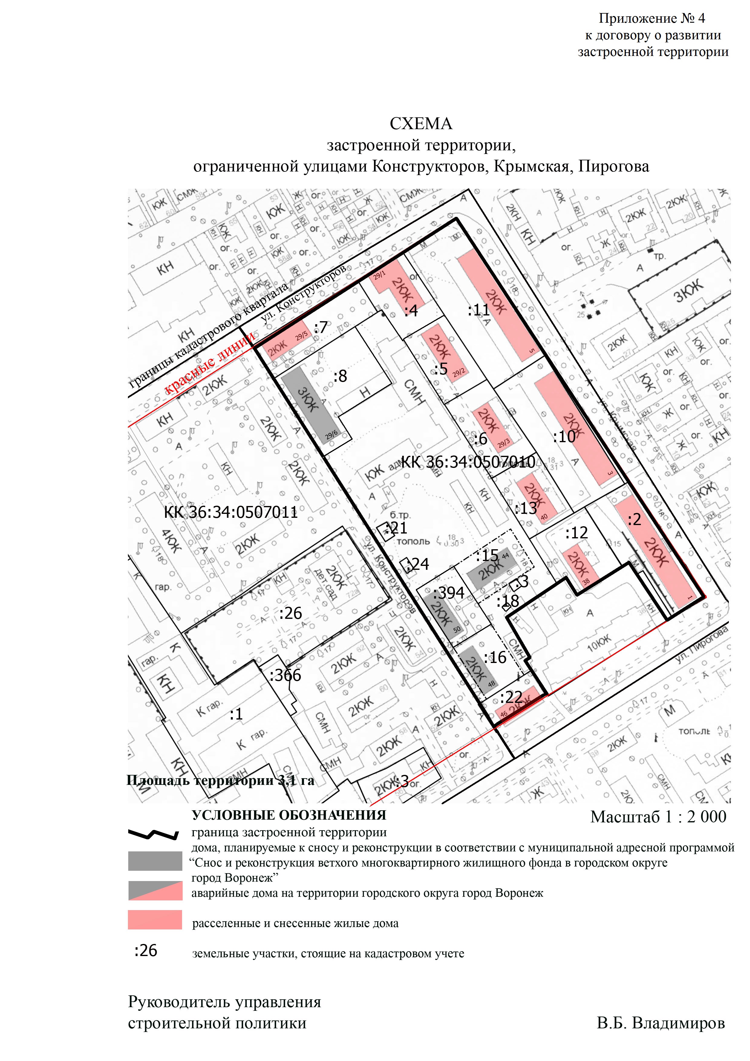 4. Реквизиты решения о развитии застроенной территории в целях жилищного строительства: Постановление администрации городского округа город Воронеж от 21.09.2015г. № 724 «О развитии застроенной территории, ограниченной улицами Конструкторов-Крымская-Пирогова в городском округе город Воронеж».